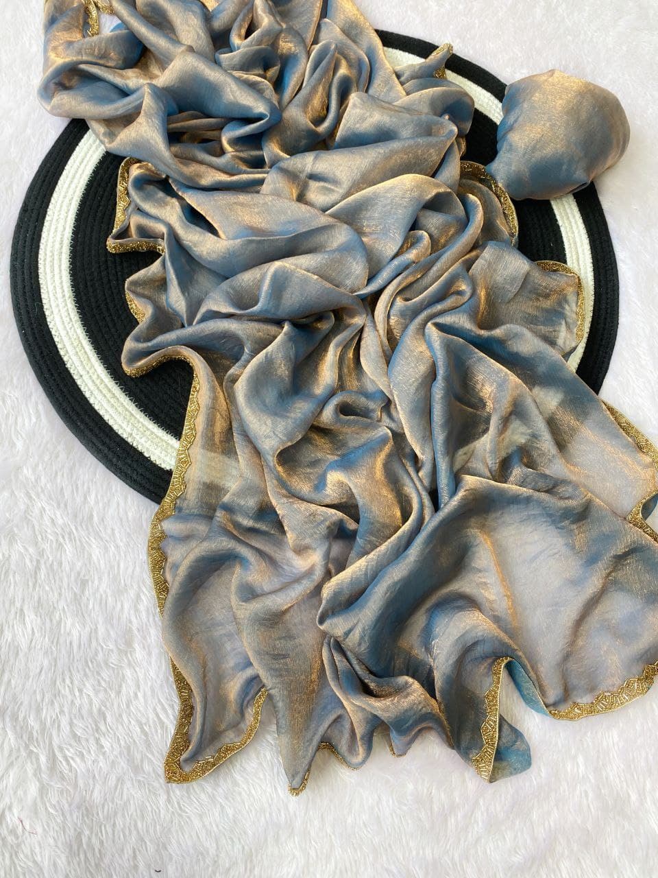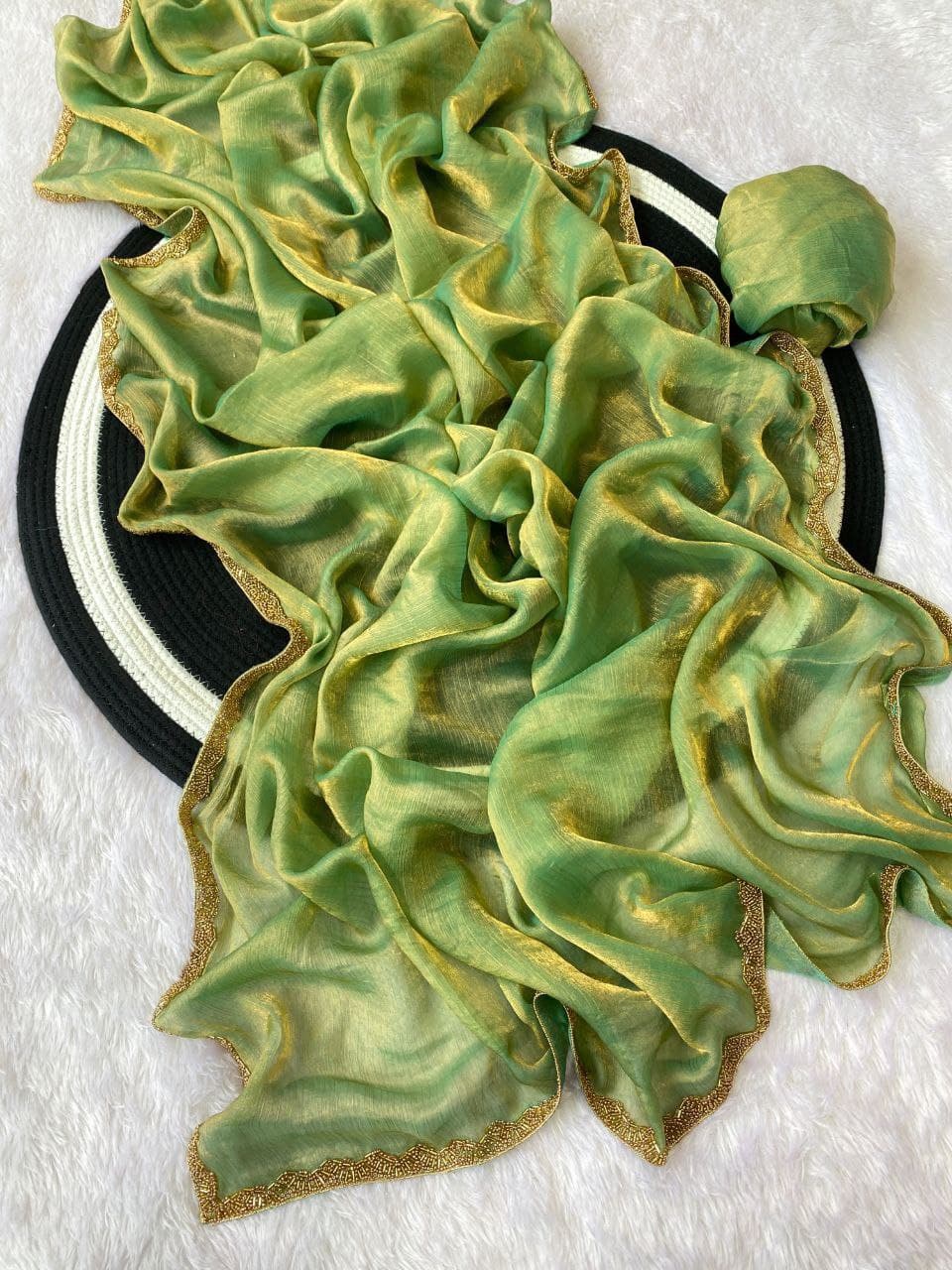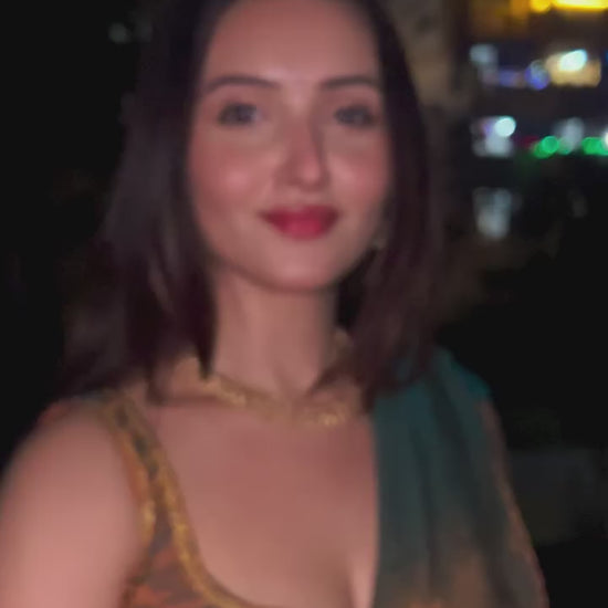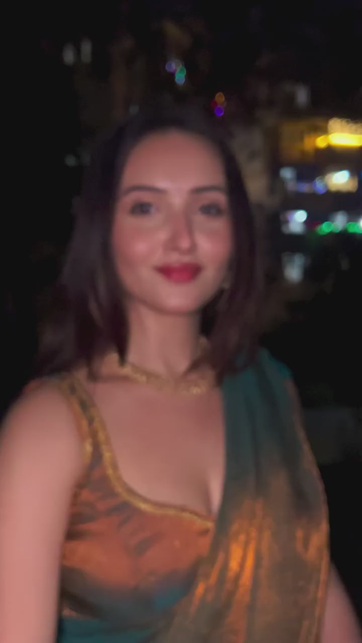 Introducing the Apsara Fendy Chiffon Saree, a true blend of elegance and modern charm. Crafted from premium two-tone fendy chiffon with a special shimmer golden finish, this limited-edition saree is designed to make you shine at weddings, parties, and festive occasions. The rich beads handwork with intricate border detailing adds a luxurious touch, while the lightweight chiffon drapes gracefully for effortless style.