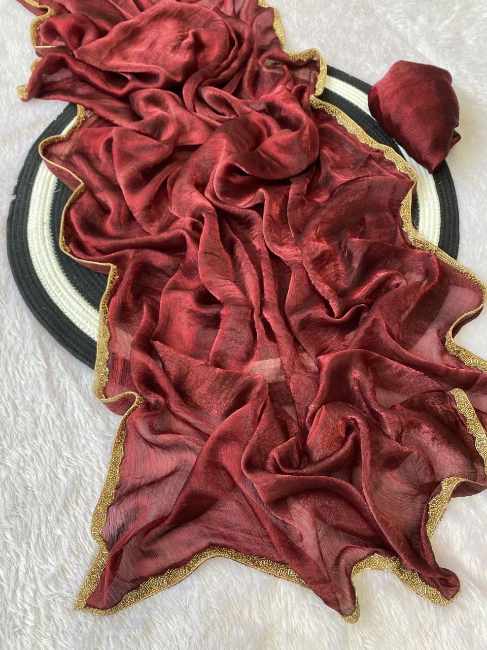 It comes with a matching running blouse adorned with delicate handwork lace, offering endless styling possibilities. Available in 12 stunning colors, this saree is perfect for women who want to stand out with sophistication.