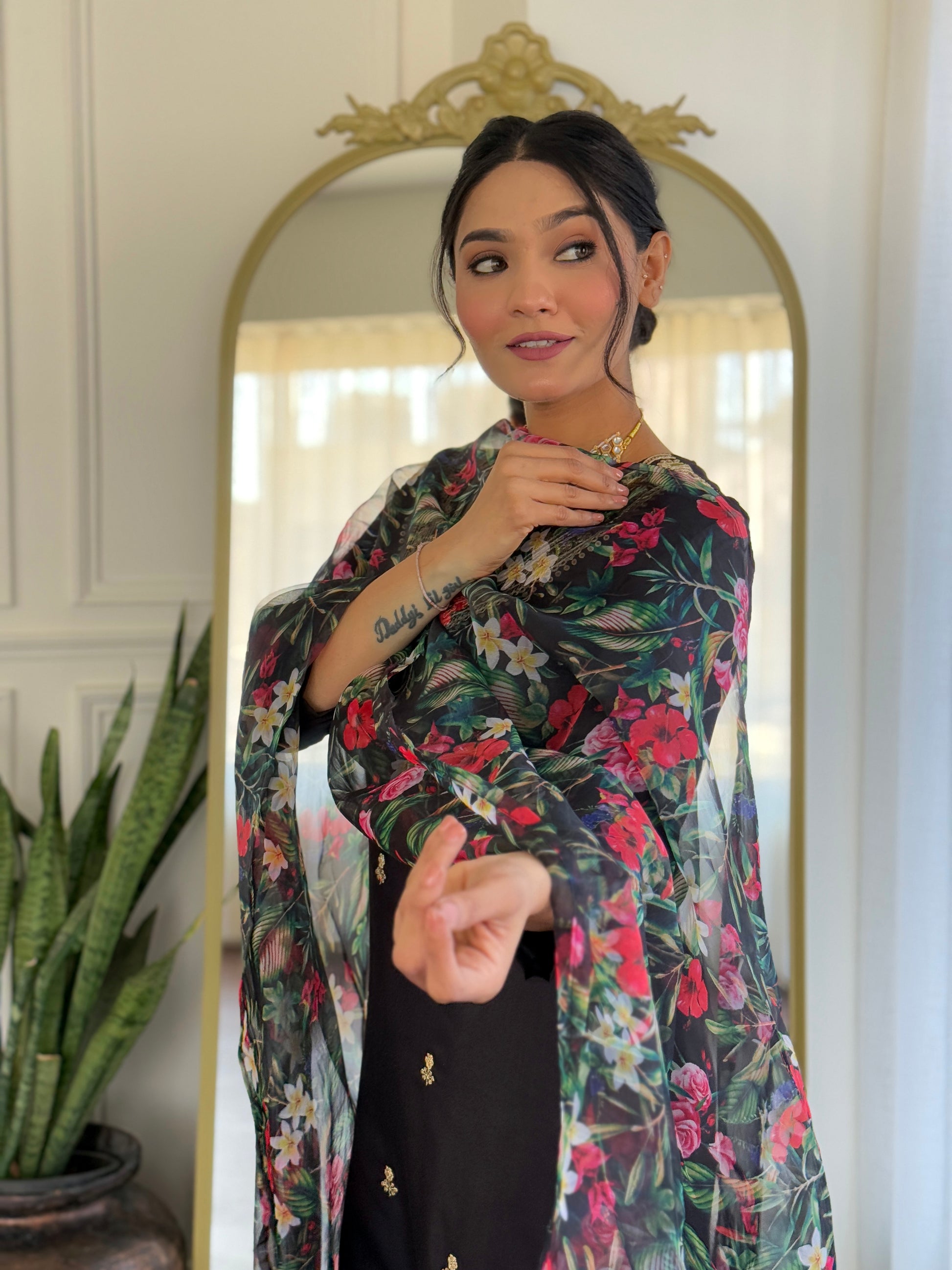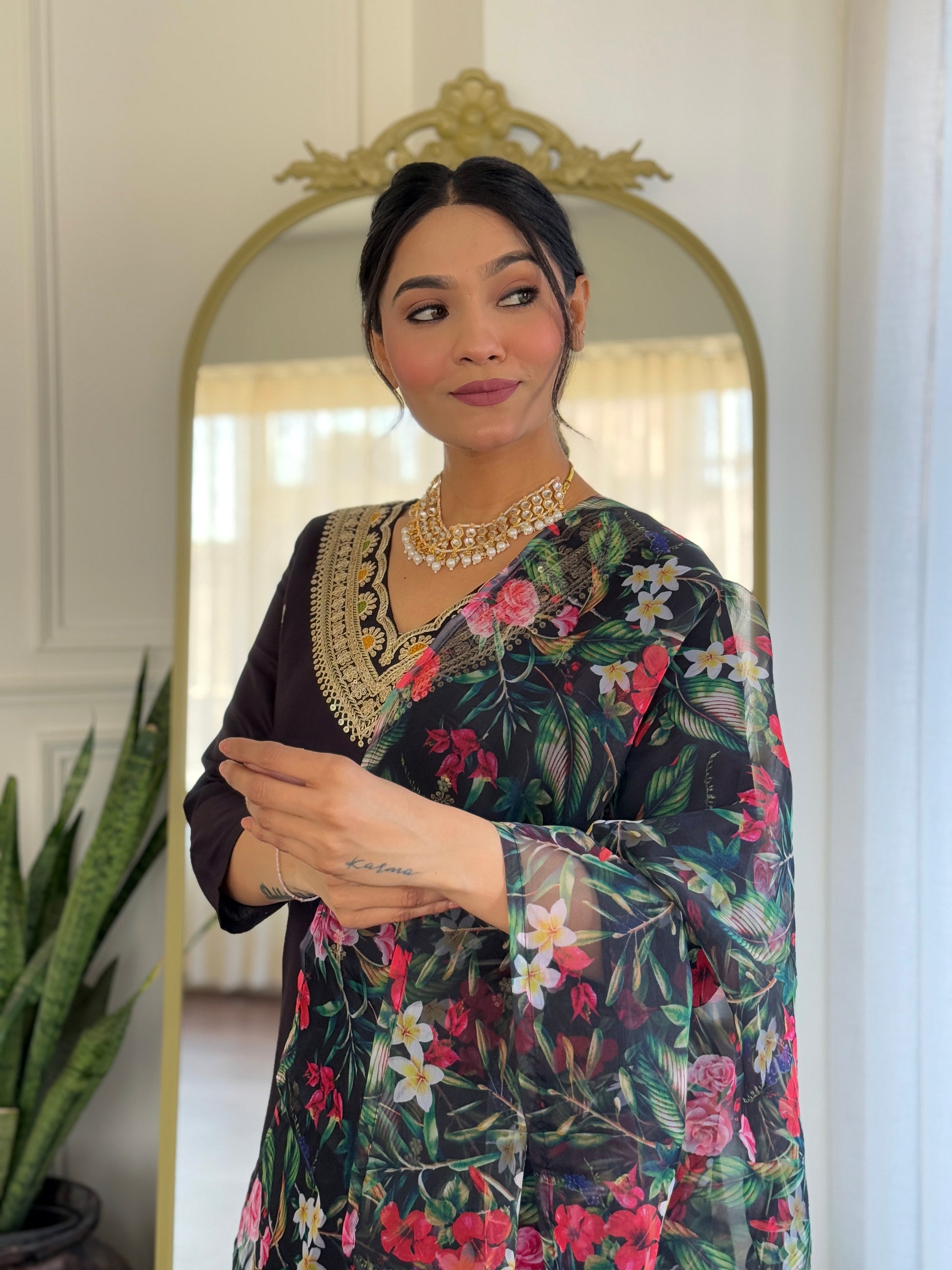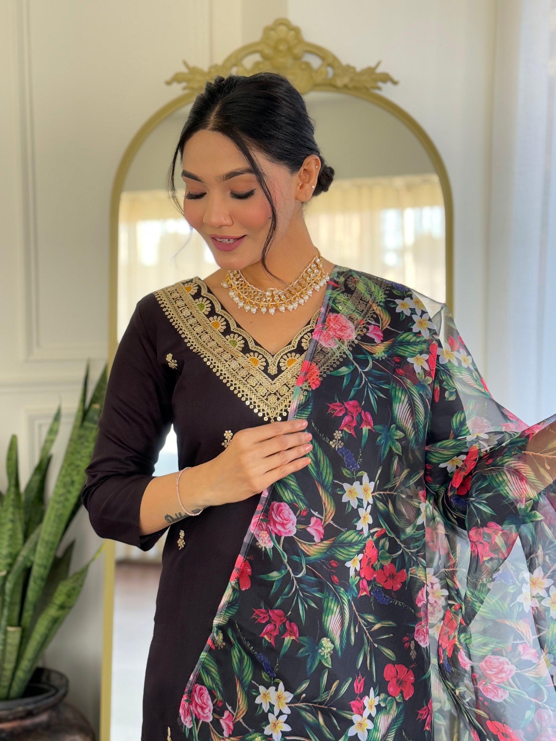 Introducing the Black Designer Kurti Set from our 100 collection. Crafted with premium fabrics, this elegant ensemble includes: